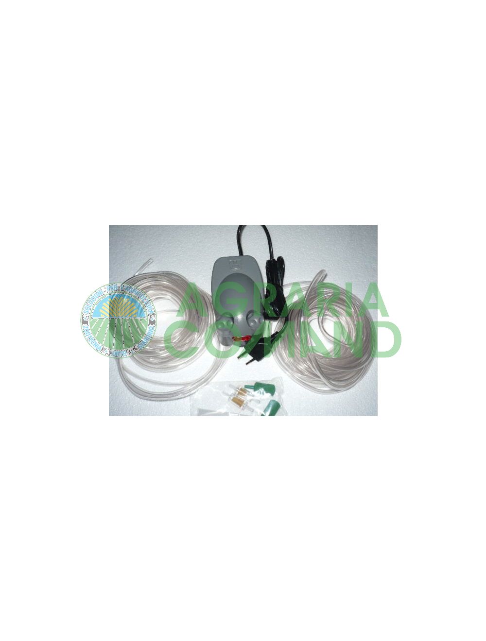 Aereatore ossigenatore adatto per l'installazione nel laghetto. Il kit è composto da un aereatore da 2*190 l/h con portata regolabile , da due pietre porose, da due valvola di non ritorno e da 2 rotoli di tubo per il collegamento da 10 metri l'uno