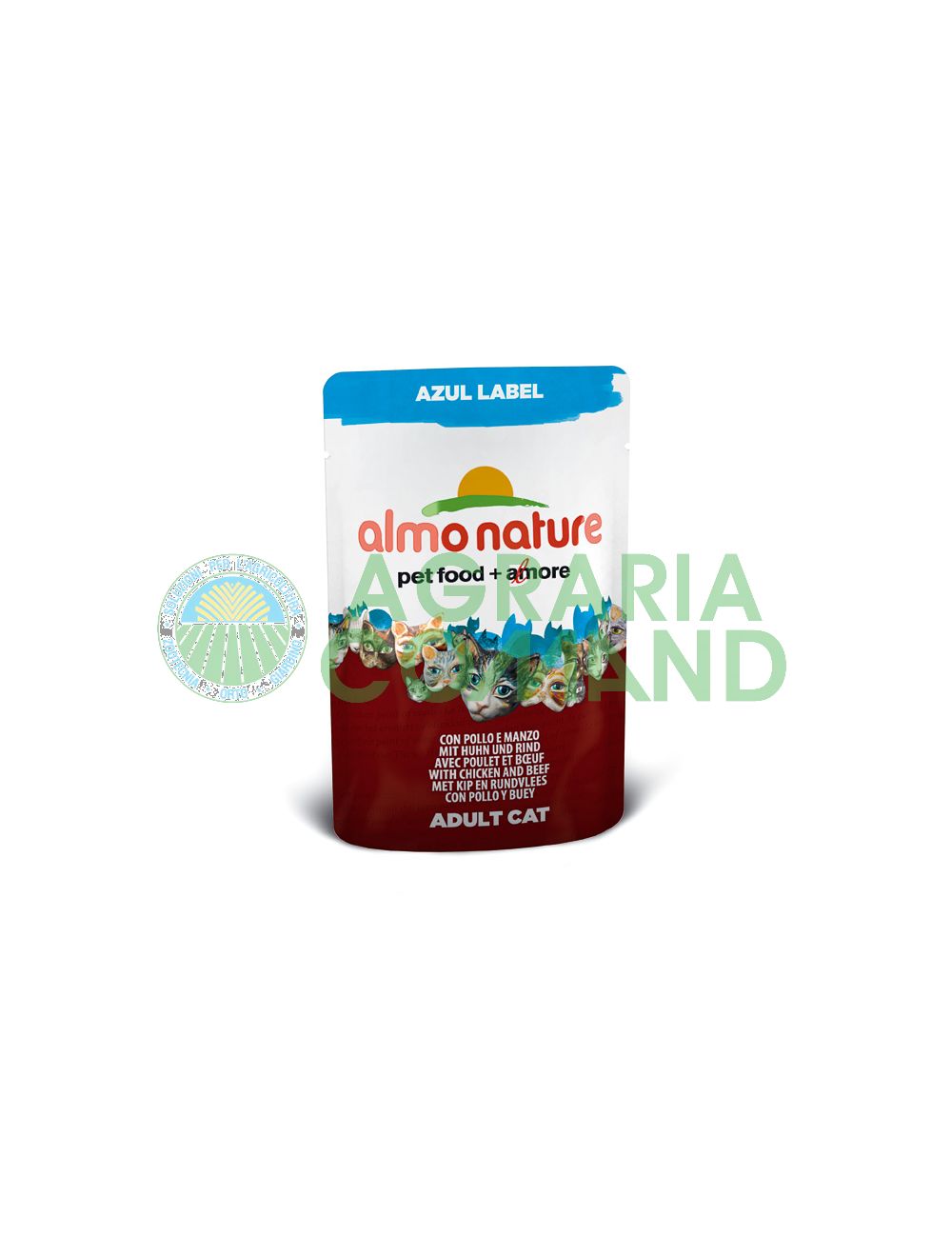 Alimento cibo umido per gatti. Le ricette Almo Nature Azul Label sono composte da ingredienti pregiati idonei solo al petfood. La gamma Azul Label propone prodotti umidi e snack.