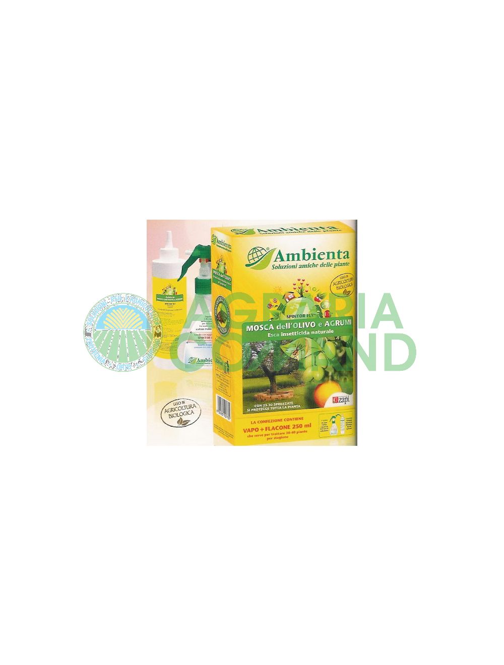 È una nuova esca insetticida di origine naturale per la difesa dalle Mosche della Frutta (Ditteri Tripetidi), contenente dosi estremamente ridotte di Spinosad una sostanza naturale ottenuta dalla fermentazione svolta da un batterio del suolo (Saccharopolyspora spinosa). Per la sua particolare formulazione in esca, Ambienta Mosca dell’Olivo e Agrumi differisce da una normale applicazione perché viene distribuito con un trattamento localizzato, sufficiente per garantire la protezione dell’intera pianta. Ambienta Mosca dell’Olivo e Agrumi non risulta pericoloso per l’utilizzatore, l’ambiente, gli insetti utili e non lascia residui nella frutta: per questo motivo è ammesso l’utilizzo anche in agricoltura biologica