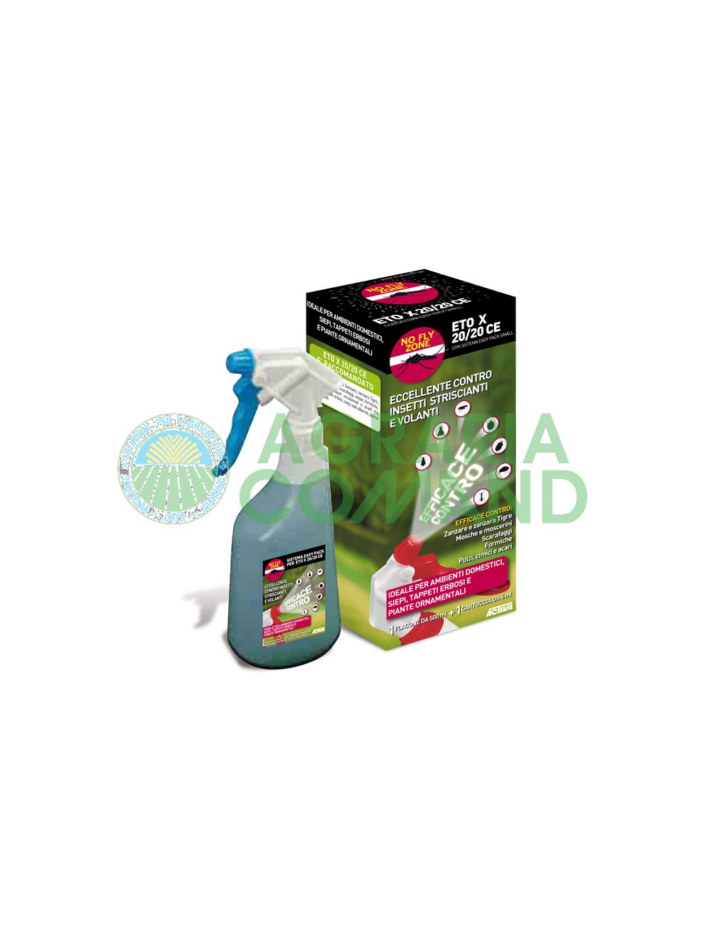 Caratteristiche: sistema di erogazione insetticida con trigger per uso domestico, civile e professionale a rapido effetto e lunga azione residuale. Agisce per contatto o ingestione, mantiene le caratteristiche e i punti di forza dei piretroidi con un migliore profilo ecologico. ETO X 20/20 CE ha la caratteristica di essere efficace nei confronti di un ampio spettro di insetti sia volanti che striscianti. Grazie alle cartucce predosate è possibile utilizzarlo in completa sicurezza riutilizzando lo stesso flacone da 0,5L.