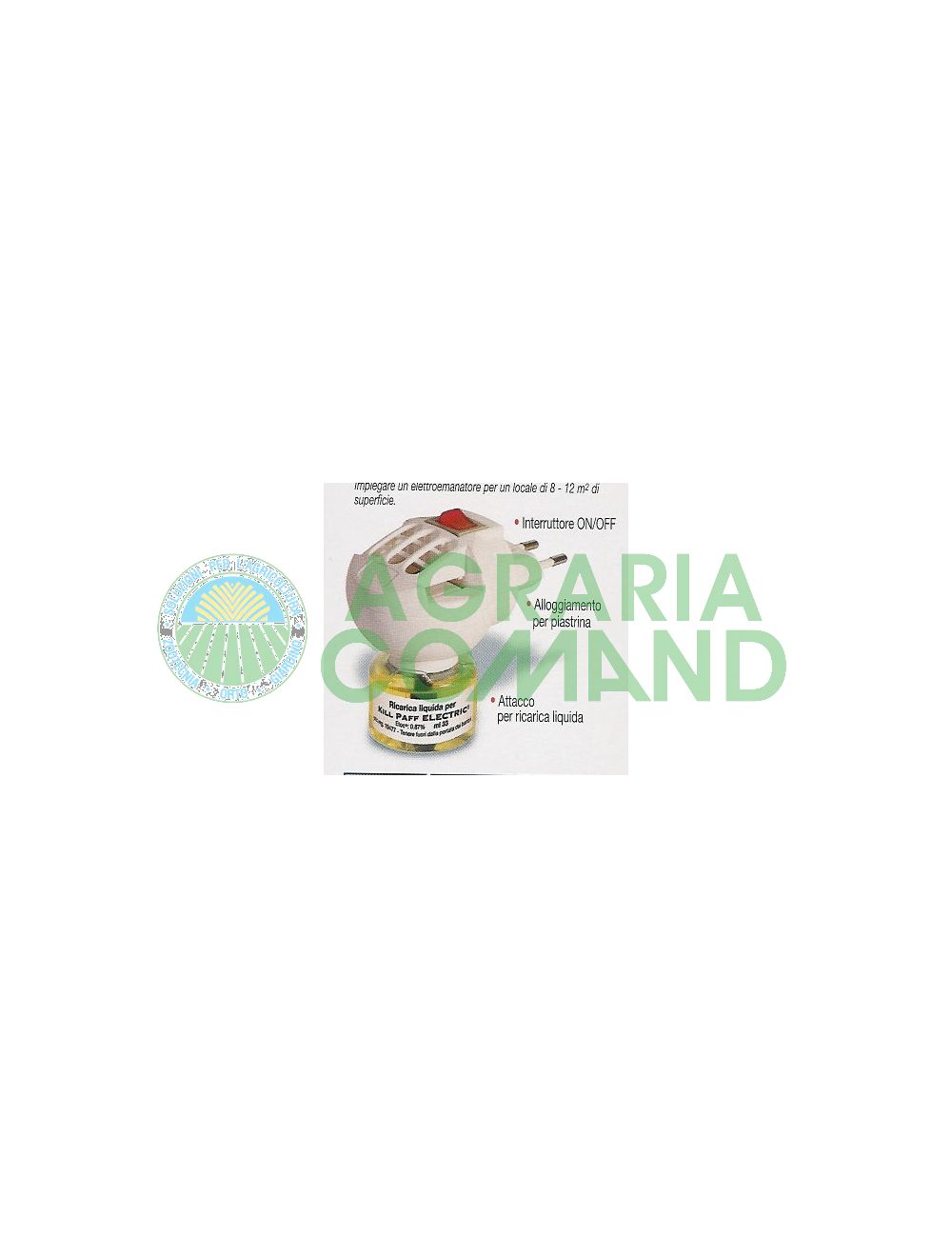 Elettroemanatore zanzaricida insetticida completo di ricarica KILL PAFF. La durata della ricarica ĆØ di 45 giorni. Efficace contro le zanzare, compresa la zanzara tigre, e le mosche di giorno e di notte. Per uso interno.