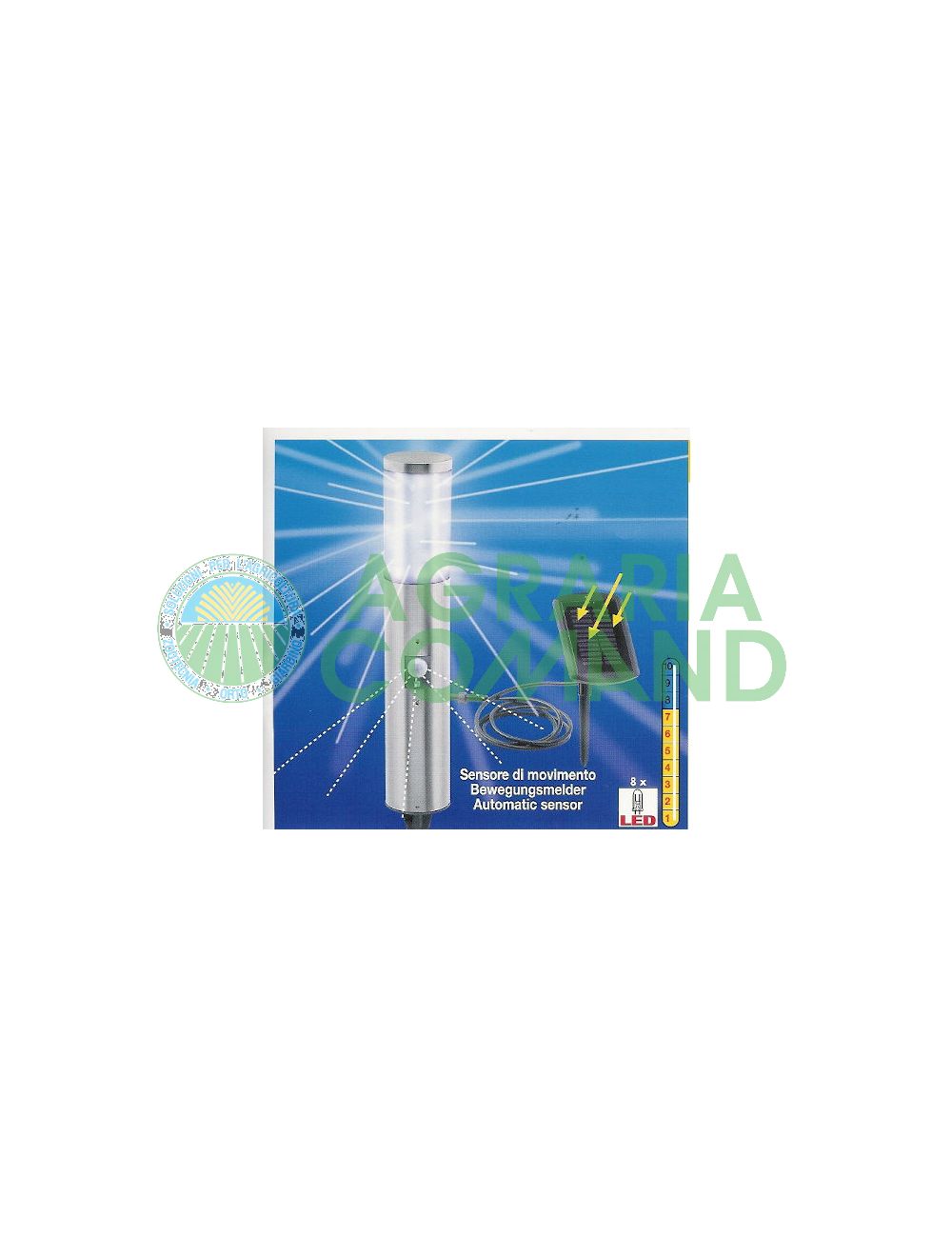 Lampada ad energia solare per giardini e parchi in INOX. 8 super LED con attivazione sensore 30 secondi. Altezza: 45cm e resistente alle intemperie.