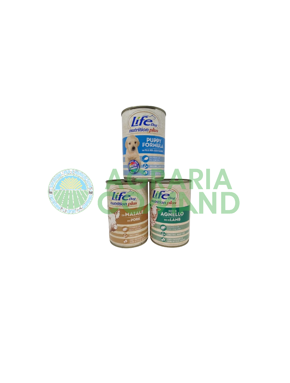 Ingredienti: agnello (30%), pollo (20%), manzo (18%), riso (4%), carote (2%), piselli (2%), porri (1%)