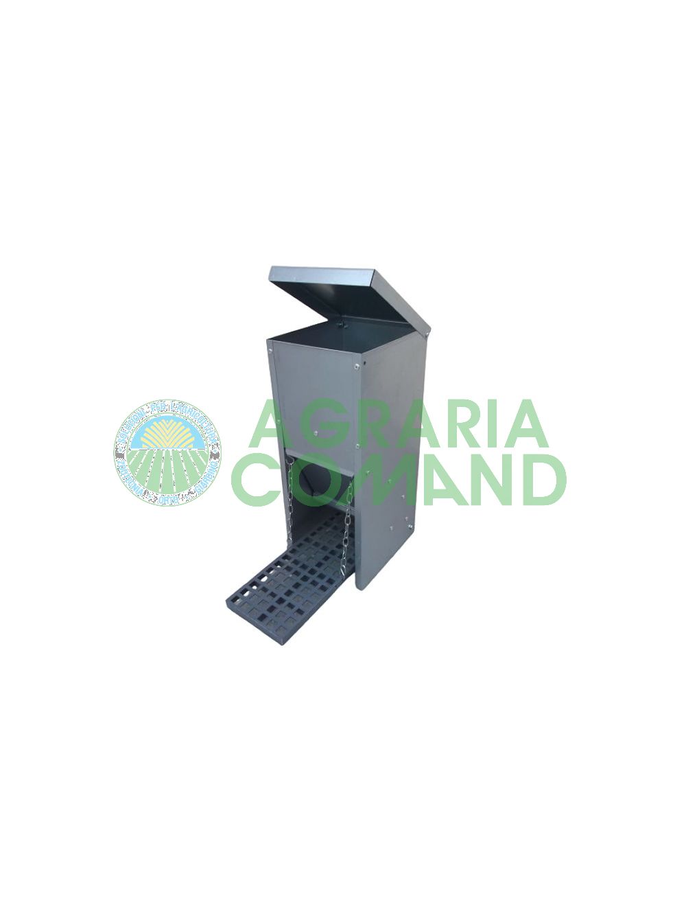 Quando un animale di peso sufficiente sale sulla pedana lo sportello di chiusura si apre per permettere l'accesso al mangime e alle granaglie, quando l'animale scende dalla pedana lo sportello si richiude. Mangiatoia adatta per polli, anatre, faraone, ecc.