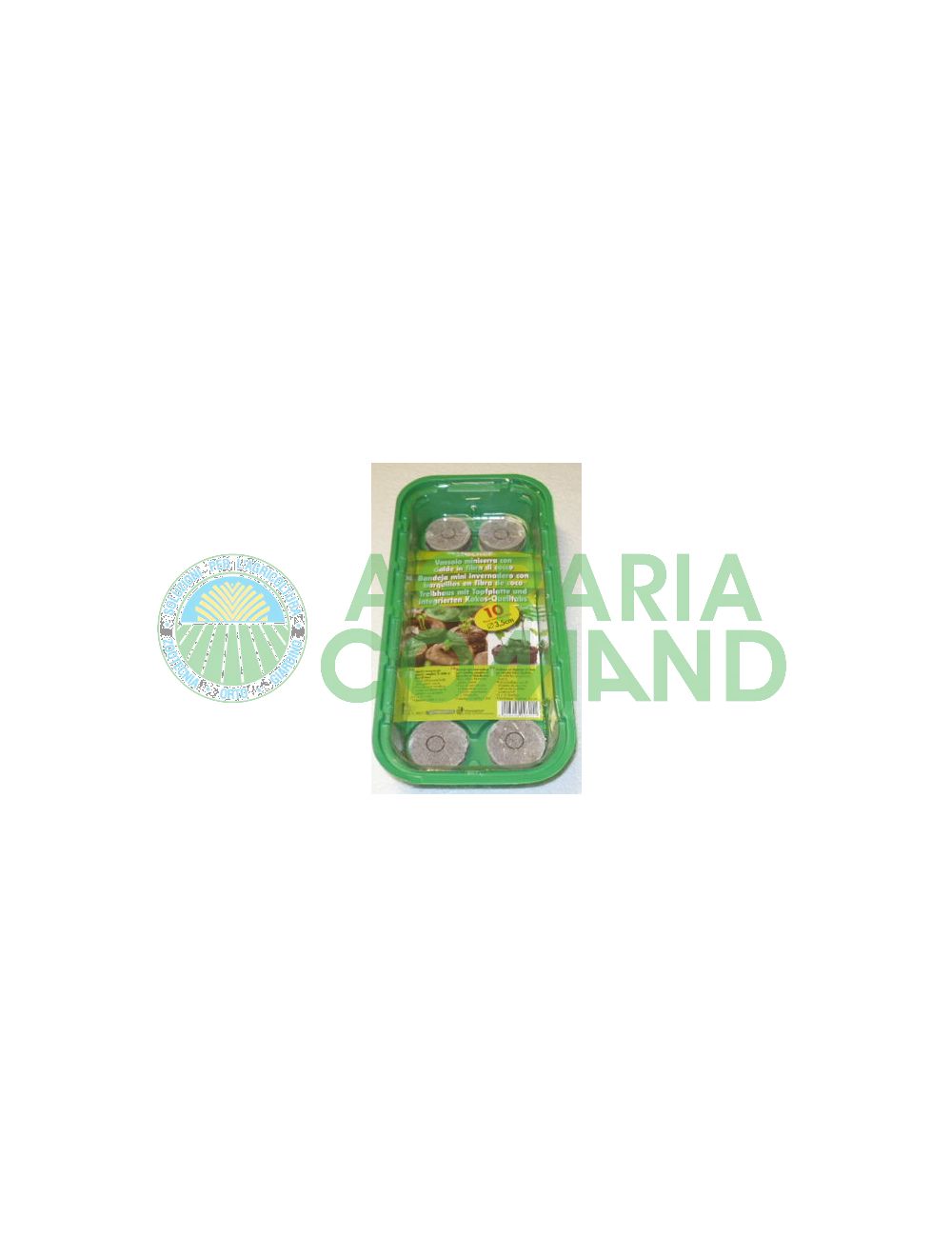 Miniserra vassoio per la coltivazione facile delle giovani piante. Fibra di cocco avvolta in tessuto non tessuto per un completo contenimento. Il vassoio contiene 10 cialde dal diametro di 3,5 cm. Le dimensioni del vassoio sono 26 x 12 cm.