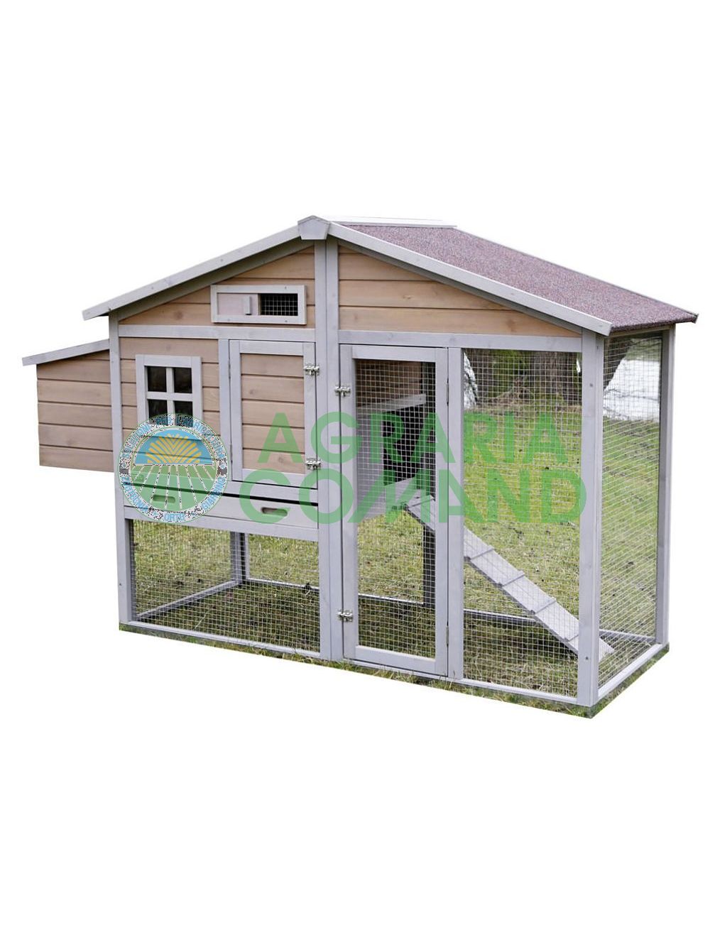 Dotato di due posatoi e di un piano rialzato ideale come zona di riposo. Zona nido con due contenitori, completamente apribile per la raccolta delle uova e la pulizia. Vasca in plastica estraibile alta 5 cm, per una facile pulizia. Munito di tetto spiovente ricoperto da una guaina impermeabile di bitume resistente agli agenti atmosferici e di un pratico sottotetto per lo stoccaggio del mangime o della paglia.