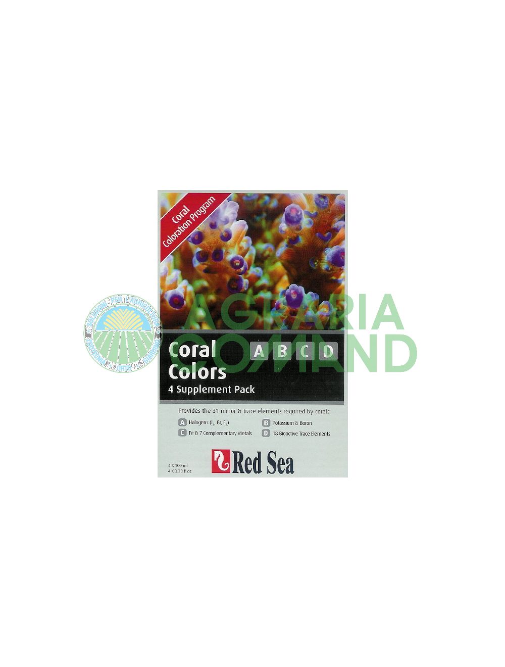 Integratore microelementi per acquario marino. Gli integratori Coral Colors A B C D contengono i 31 elementi secondari e residui presenti nello scheletro e nel tessuto molle di tutti i coralli. Gli elementi in ogni integratore sono accomunati dalla rispettiva funzione biologica e sono associati alla produzione di pigmenti specifici (rosa,rosso, verde, giallo, porpora, blu) nel tessuto molle dei coralli con scheletro calcareo. Tutti i 31 elementi sono necessari per tutti i coralli con scheletro calcareo indipendentemente dal colore attuale dei coralli. Gli integratori Coral Colors A B C D dovrebbero essere dosati soltanto a seconda del fabbisogno misurato dell'acquario. Per ottenere coralli con pigmanti di elevata qualità usare l' NO3: PO4-x Red Sea come parte del Reef Care Ptogram completo.