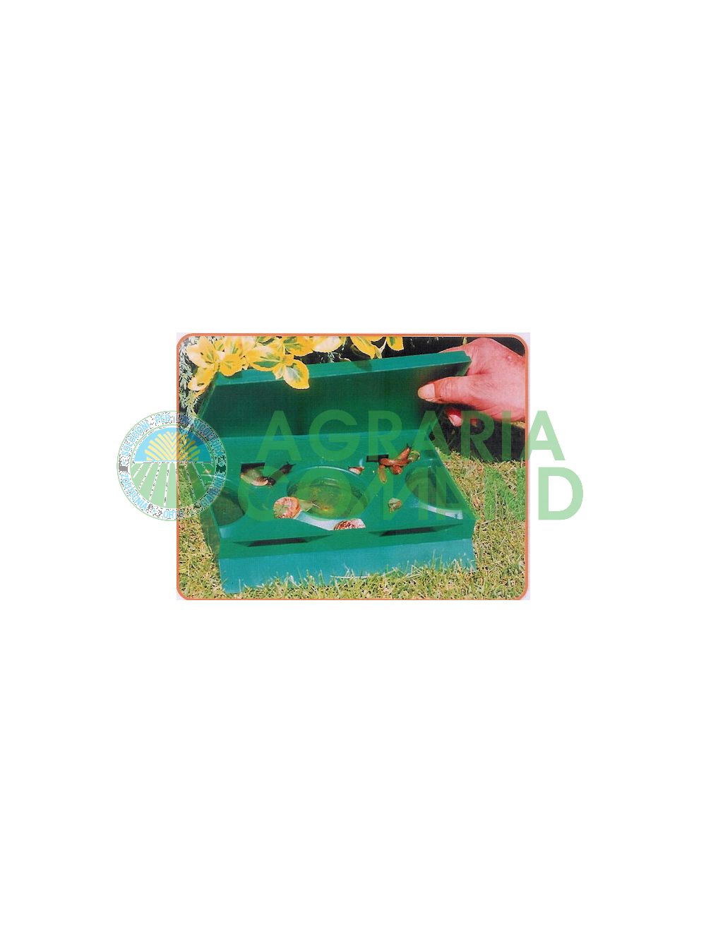Trappola cattura lumache e limaccee. SLUG X è una trappola rivoluzionaria che cattura i peggiori nemici di ortolani e giardinieri, le LUMACHE e le LIMACCE (con o senza guscio), in modo assolutamente naturale. Può essere spostata ogni giorno in un posto diverso e può essere riposta fuori vista durante le ore di luce. Si può utilizzare su qualsiasi superficie piana (ORTI, GIARDINI, PRATI, CORTILI, TERRAZZI, ecc.). Può catturare fino a 40-50 lumache/limacce in una sola notte in zone molto infestate. E' molto conveniente: dura parecchi anni. COME FUNZIONA: L’esca ideale per la trappola SLUG X® è semplicemente BIRRA DI QUALSIASI TIPO (chiara, scura, ecc.). Le lumache e le limacce saranno irresistibilmente attratte verso l'interno della trappola dal profumo della birra proveniente dai 4 fori di entrata. All'interno della trappola la forte concentrazione di profumo di birra porrà lumache e limacce in un stato di confusione totale che le renderà incapaci di trovare la via d'uscita. Molte di esse resteranno nei corridoi interni della trappola fino a 10 ore e poi andranno definitivamente dentro i pozzetti.