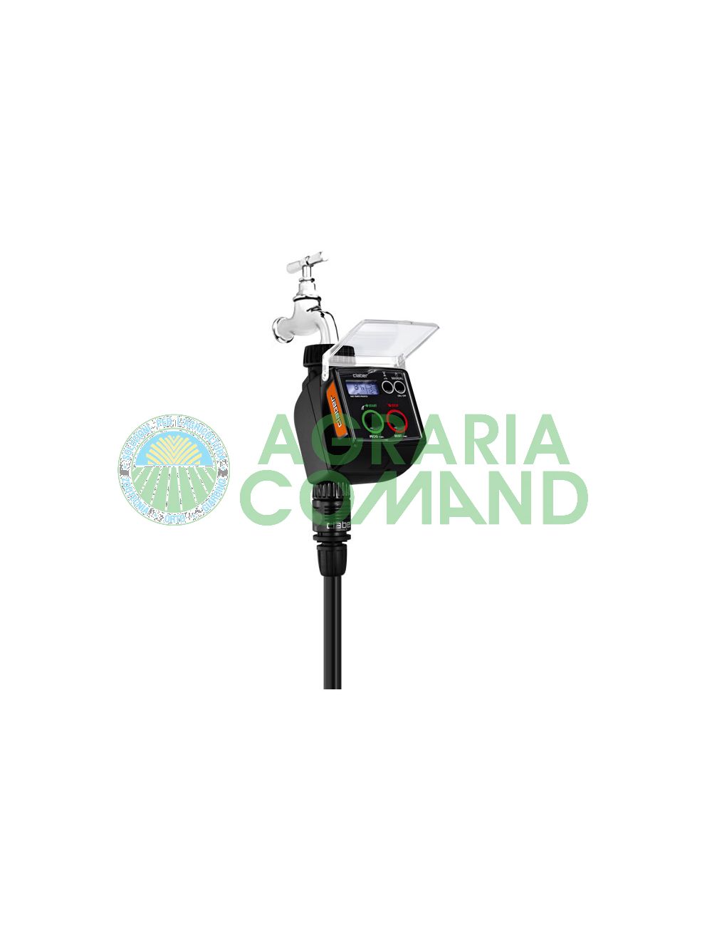 Programmatore automatico ad una via. Funziona con 2 batterie alcaline stilo tipo AA da 1,5 V, poste in un vano batterie antipioggia. Facile programmazione con 2 pulsanti. Un programma d’irrigazione personalizzabile da 1 a 60 minuti, tutti i giorni alla stessa ora. Premendo il verde si avvia il programma, quando l’irrigazione è giudicata sufficiente, si preme il rosso: Tempo Pratic memorizza il tempo intercorso. La programmazione ciclica è impostabile anche direttamente con modalità rapida. Schermo LCD retroilluminato ad alta leggibilità in ogni condizione, per la visualizzazione delle funzioni (programmazione, tempo mancante, tempo d’irrigazione, sensore pioggia). Tasto partenza immediata o ritardata 1-23 ore. Tasto di apertura manuale (15 minuti). Struttura rinforzata. Pannello frontale in bimateriale. Coperchio trasparente di protezione. Parti elettroniche isolate e assenza di cavi a vista. Attacco rubinetto 3/4” con ghiera pivotante. Filtro lavabile. Pressione di esercizio da 0,2 - 12 bar. Collegabile al Rain Sensor base (90915) oppure al Rain Sensor RF radio (90831 tramite interfaccia opzionale). Controllato e testato al 100%.